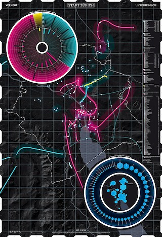 Datenvisualisierung des unterirdischen Verkehrs der Stadt Zürich. Dieses Plakat entstand anlässlich der Ausstellung Unterirdisch – Das Spektakel des Unsichtbaren im Museum für Gestaltung Zürich vom 4.7.–28.9.2014.